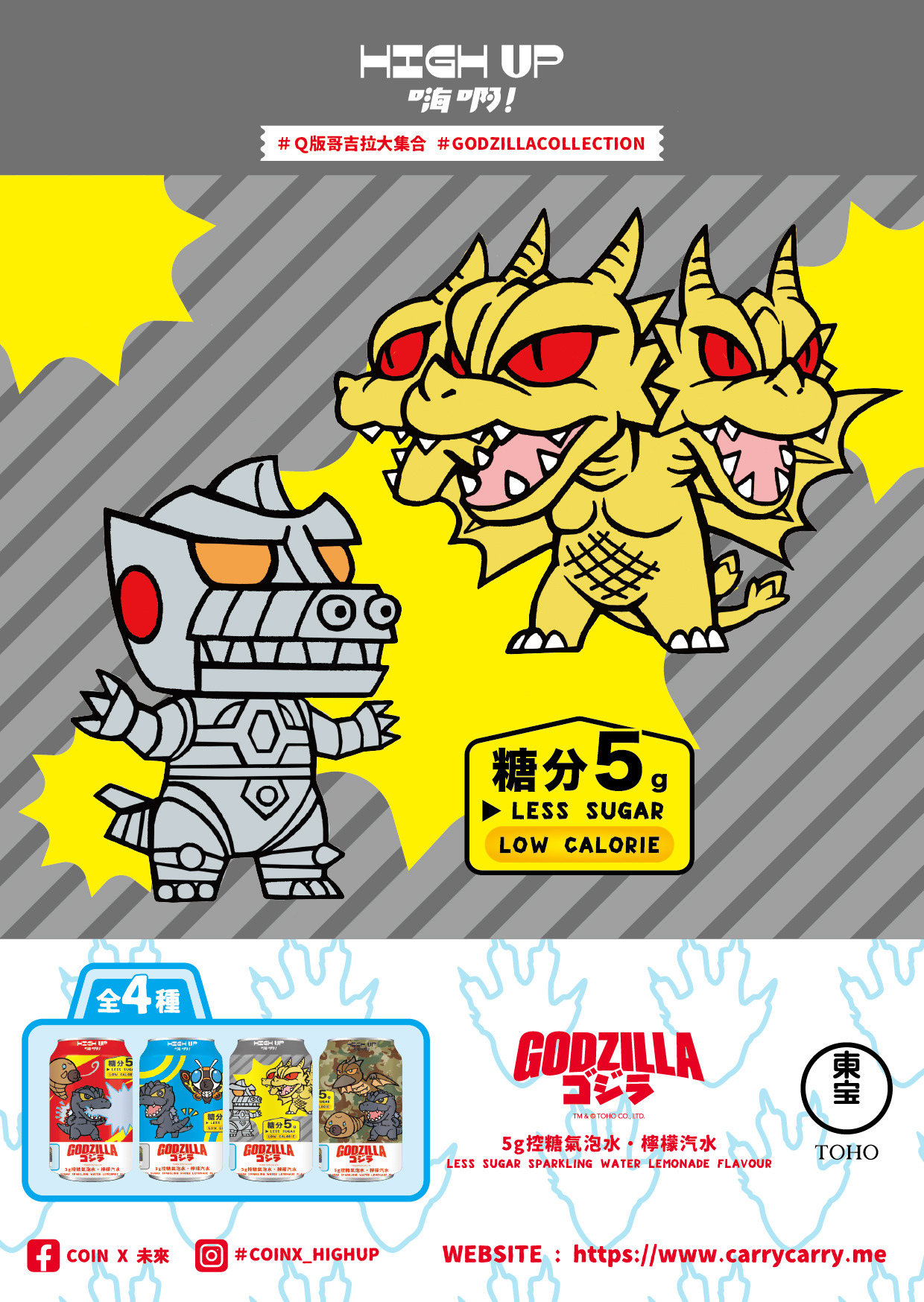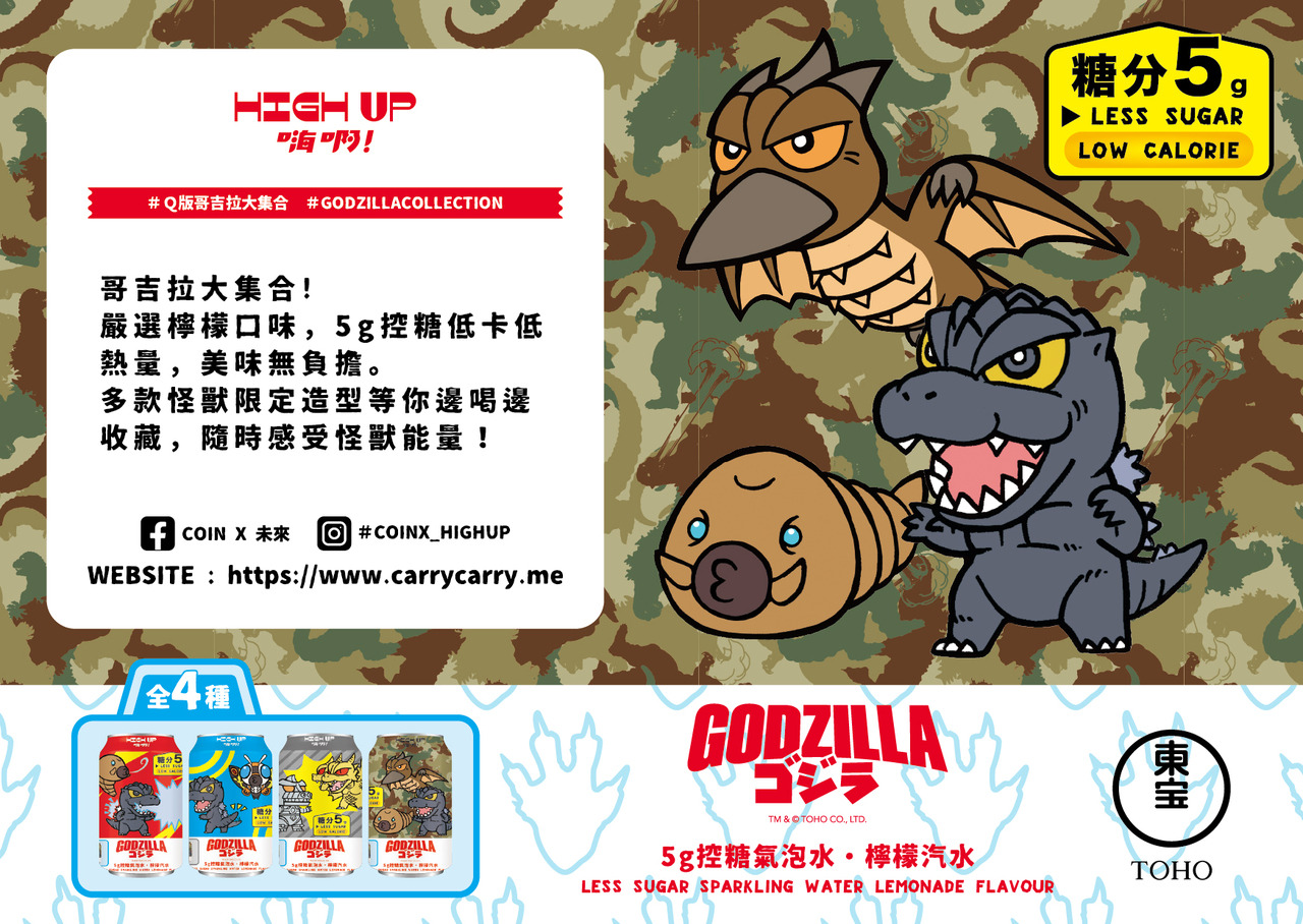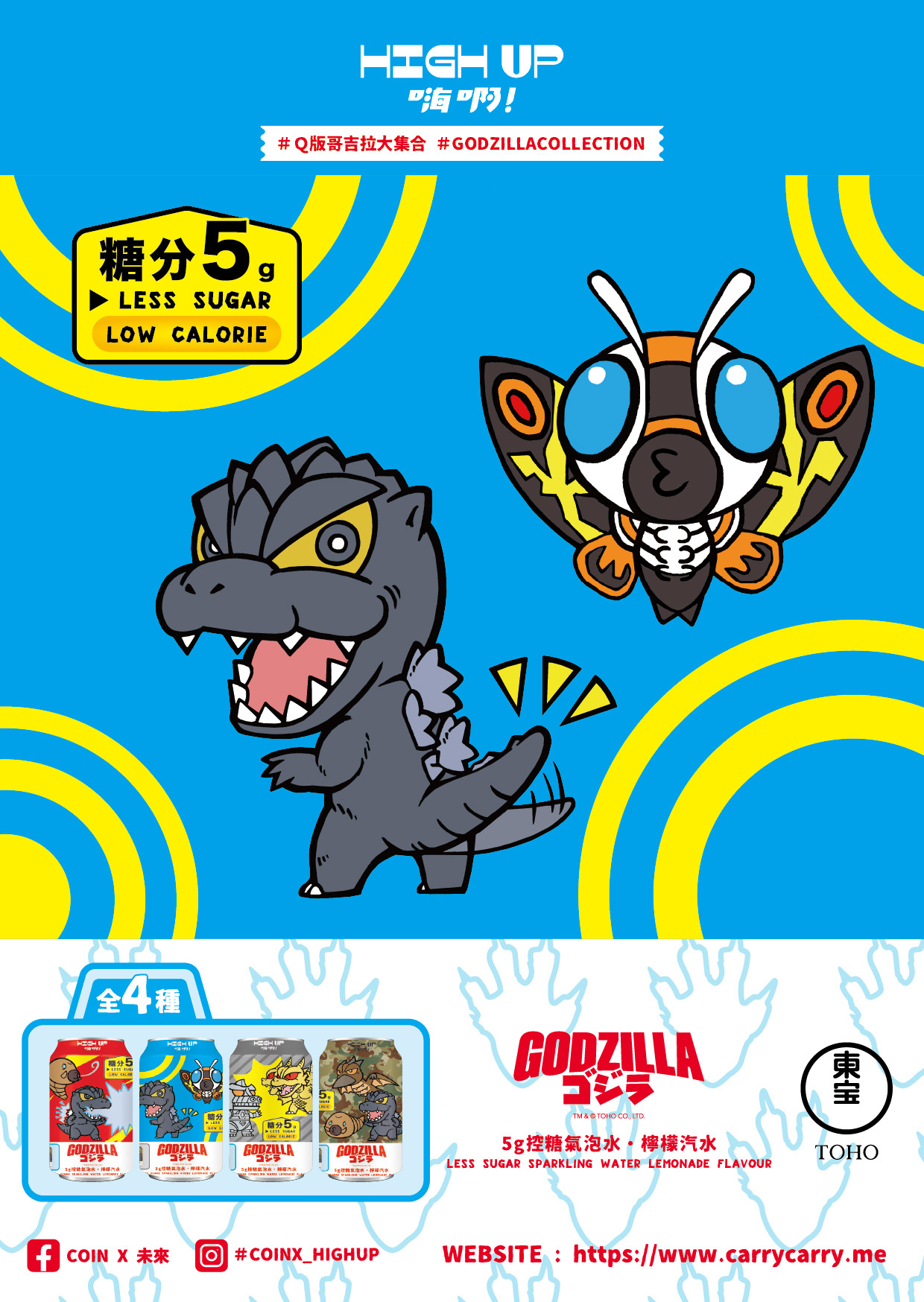 嚴選檸檬口味,5g控糖低卡低熱量,美味無負擔。 多款怪獸限定造型等你邊喝邊收藏,隨時感受怪獸能量!HIGH UP 5g 控糖氣泡水 ( 檸檬汽水風味 ) Q版哥吉拉【24入箱裝】