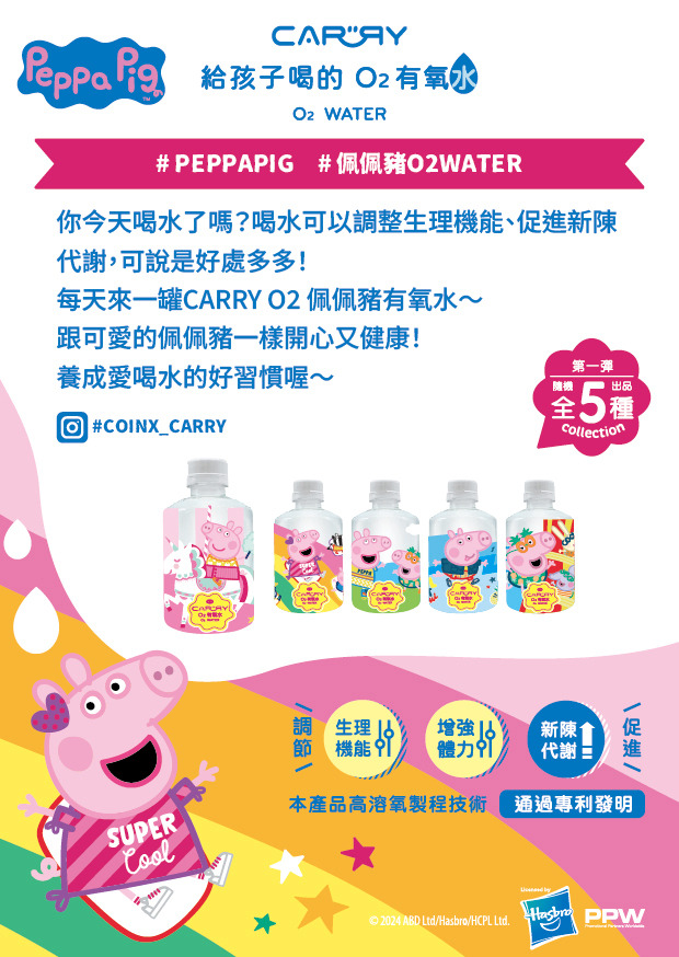 CARRY O₂有氧水攜手佩佩豬,打造孩子最喜歡的日常補水夥伴!讓喝水變得輕鬆、有趣,從小養成健康好習慣。