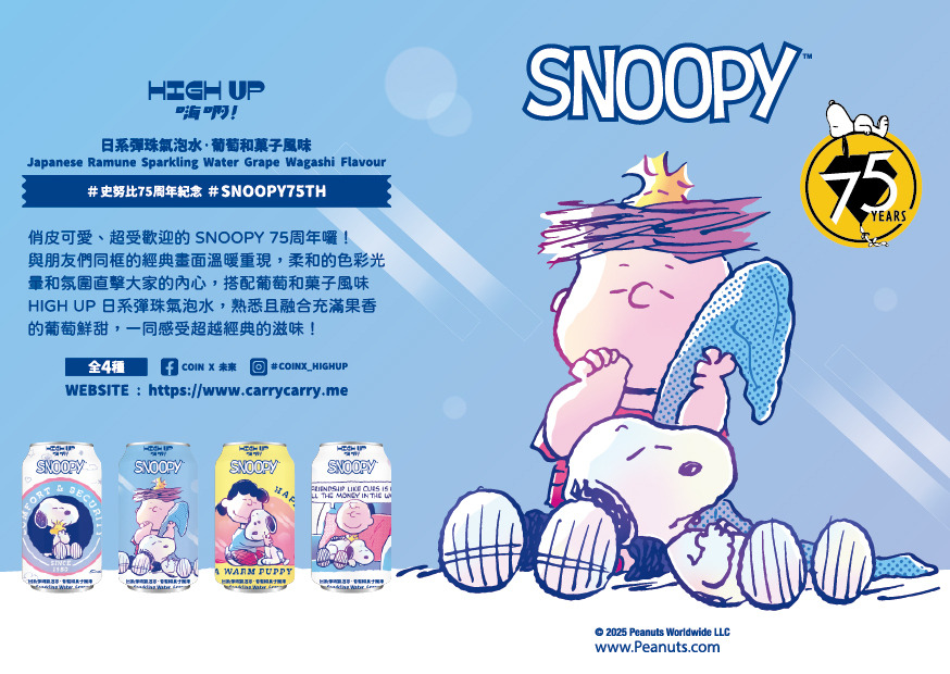與朋友們同框的經典畫面温暖重現,柔和的色彩光暈和氛圍直擊大家的內心,搭配葡萄和菓子風味HIGH UP 日系彈珠氣泡水,熟悉且融合充滿果香的葡萄鮮甜,一同感受超越經典的滋味!HIGH UP 日系彈珠氣泡水(葡萄和菓子風味)史努比【24入箱裝】